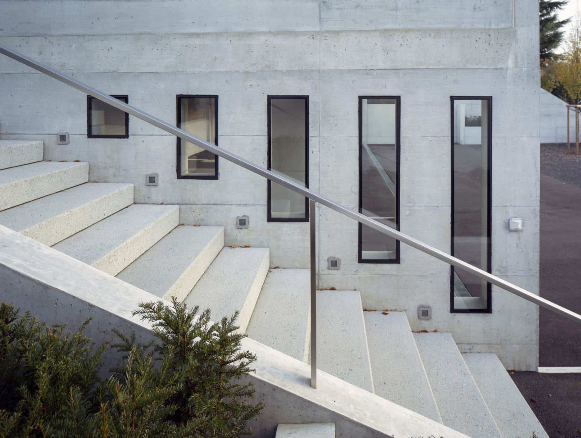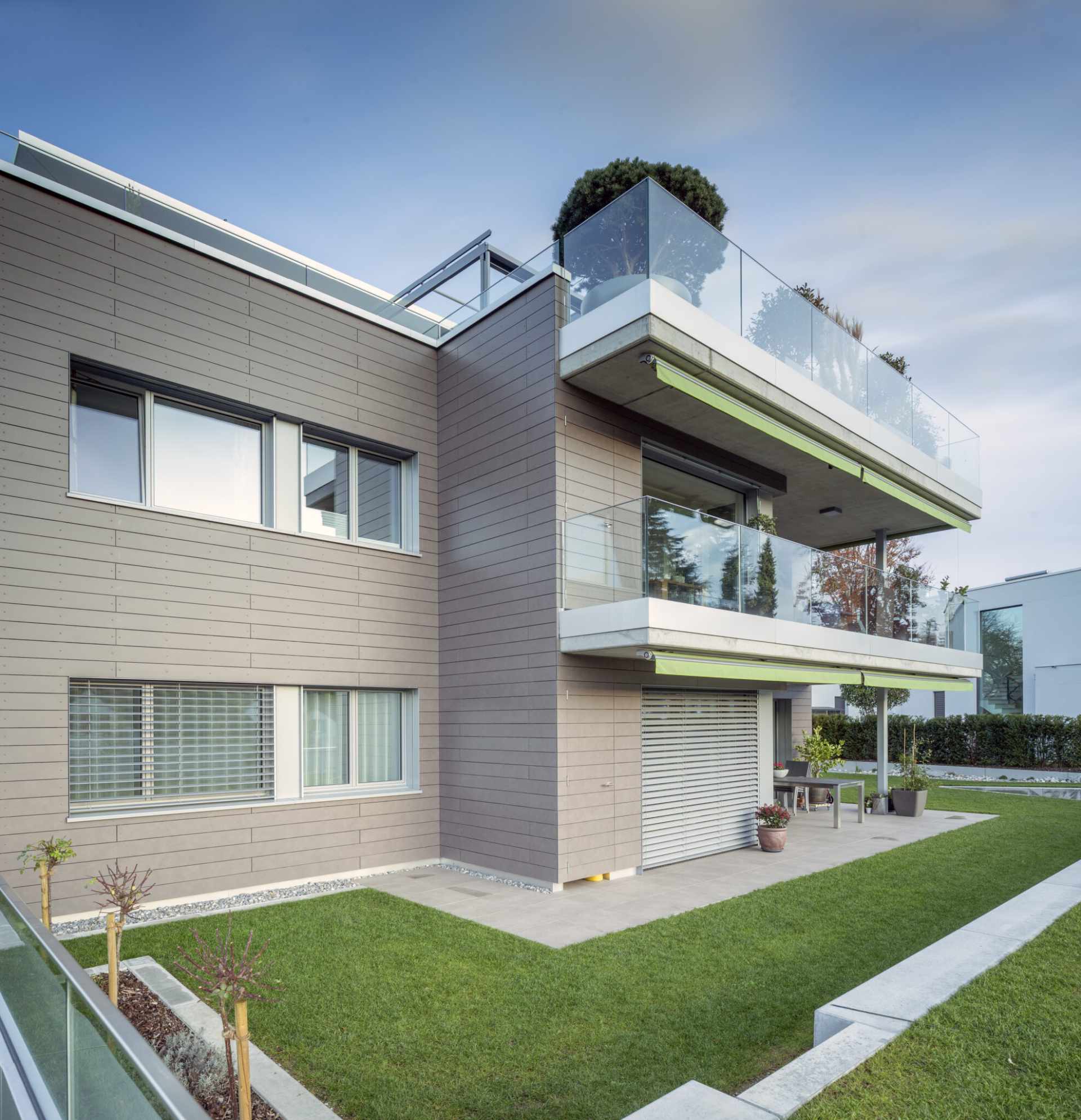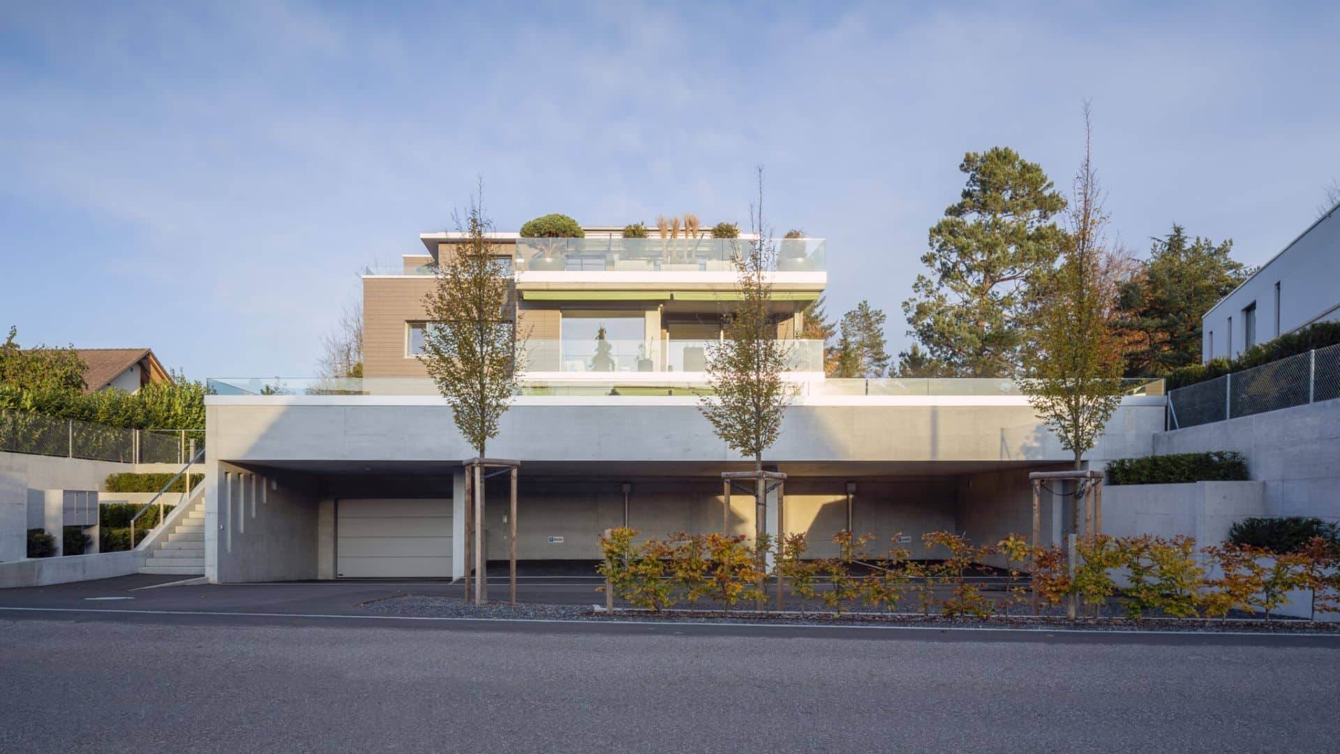 Das Mehrfamilienhaus wurde in solider Massivbauweise errichtet und mit einer hinterlüfteten Eternitfassade ausgestattet. Das Sockelgeschoss mit Einstellhalle und Kellerräumen wurde auf der Westseite in Sichtbeton mit Schaltafelstruktur umgesetzt – ein architektonisches Detail, das dem Gebäude eine einladende und moderne Erscheinung verleiht.