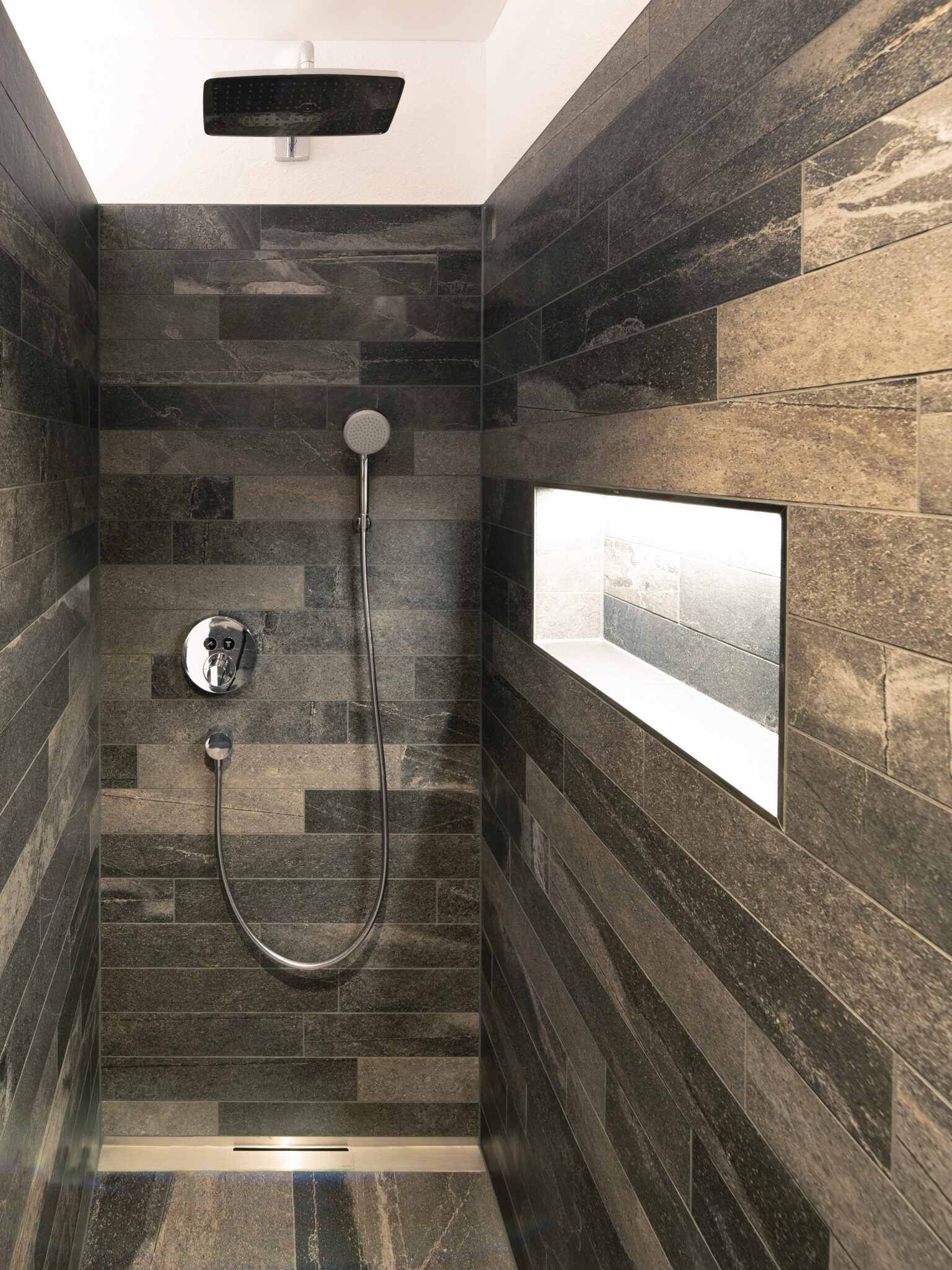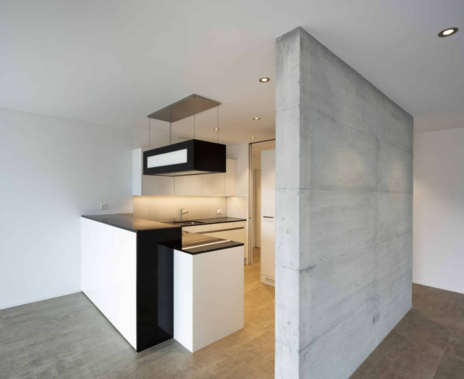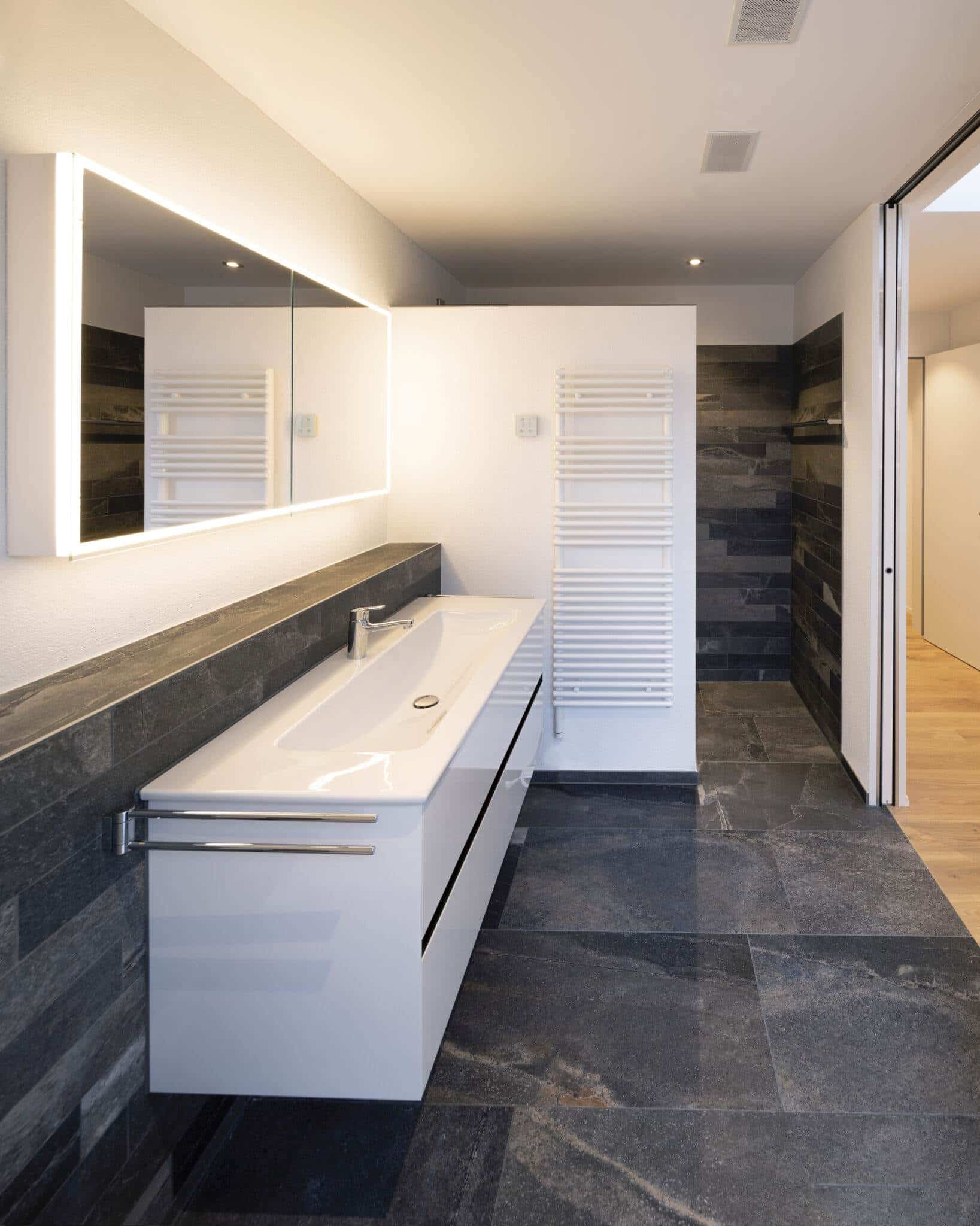 Das Mehrfamilienhaus wurde in solider Massivbauweise errichtet und mit einer hinterlüfteten Eternitfassade ausgestattet. Das Sockelgeschoss mit Einstellhalle und Kellerräumen wurde auf der Westseite in Sichtbeton mit Schaltafelstruktur umgesetzt – ein architektonisches Detail, das dem Gebäude eine einladende und moderne Erscheinung verleiht.