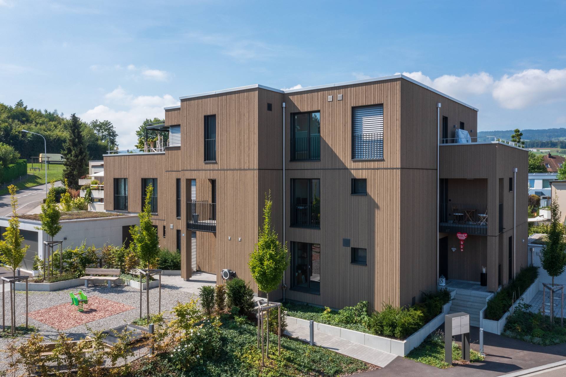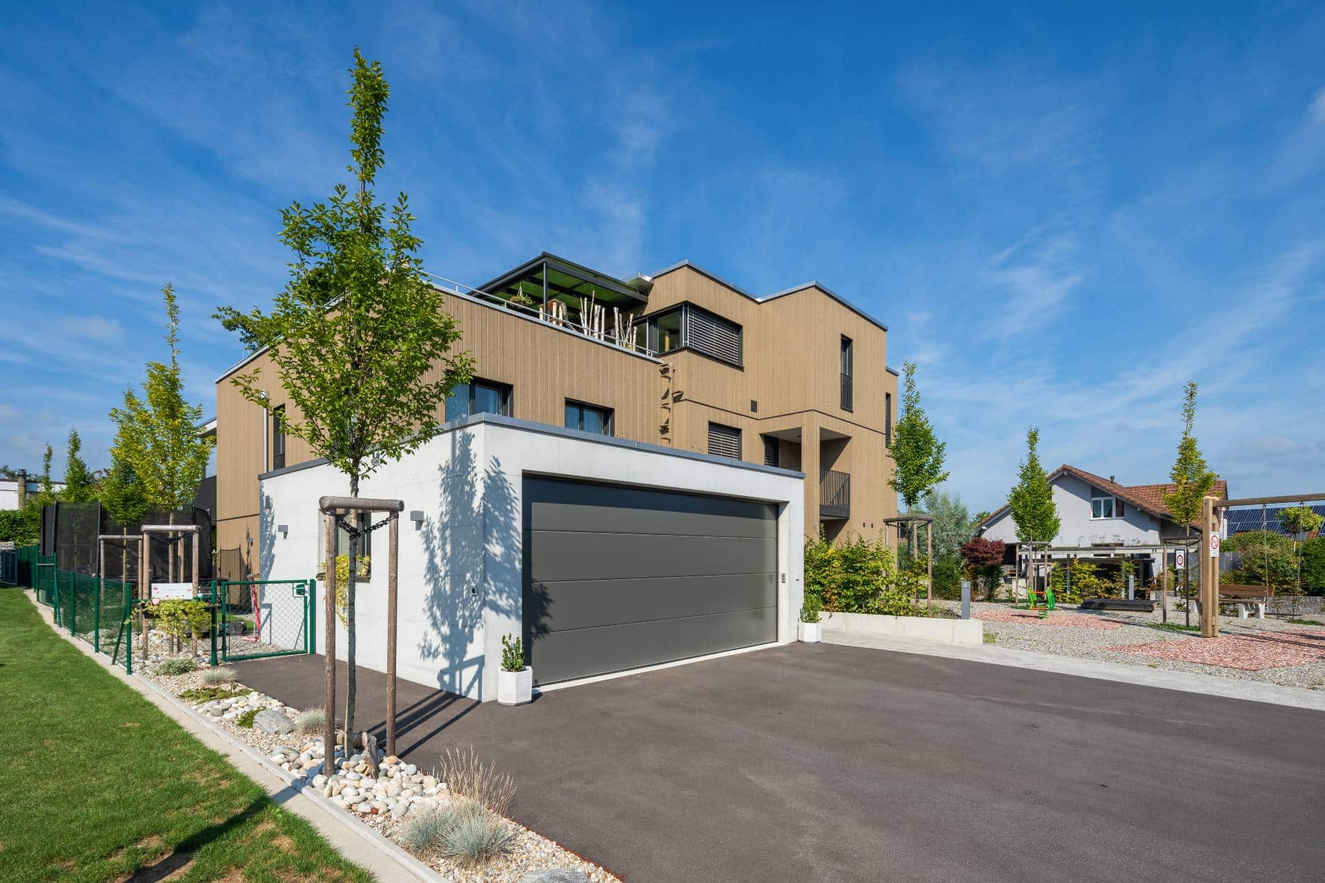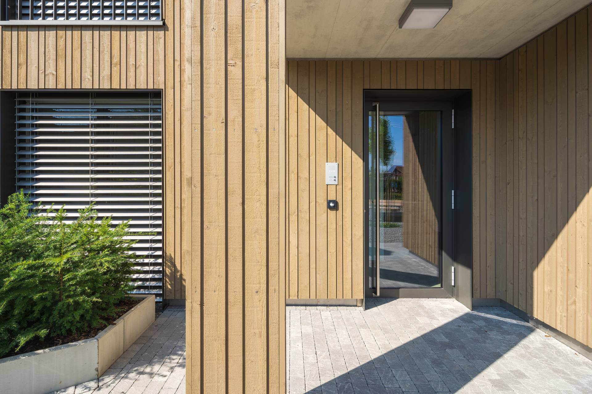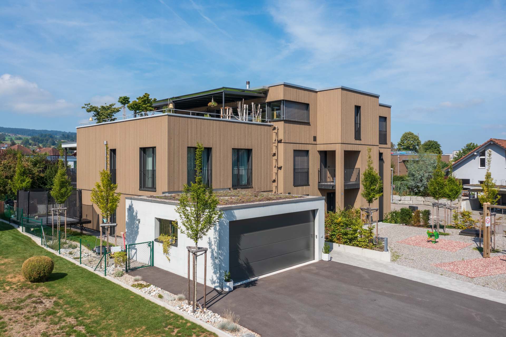 Der Neubau wurde in solider Massivbauweise erstellt und mit einer hochwertigen, hinterlüfteten Holzfassade ausgestattet. Die klare architektonische Sprache sowie die nachhaltige Materialisierung sorgen für ein zeitgemässes und wertbeständiges Erscheinungsbild.