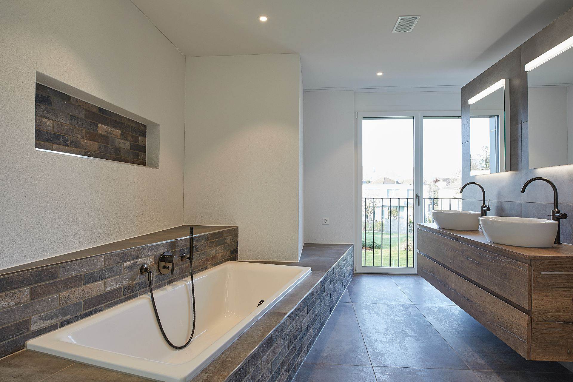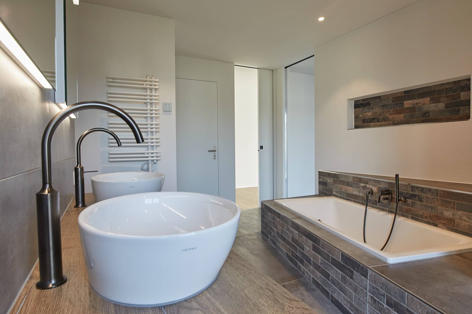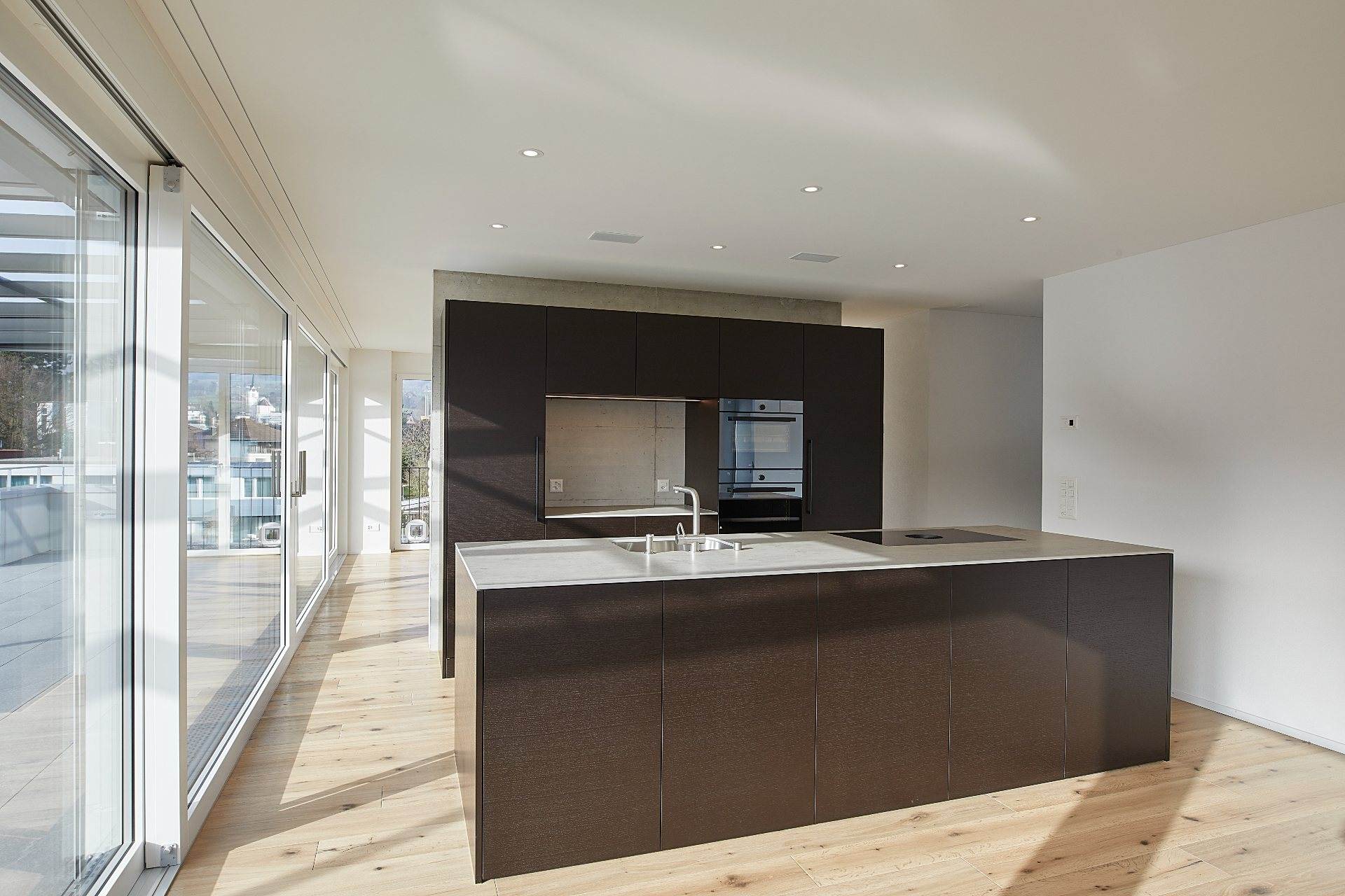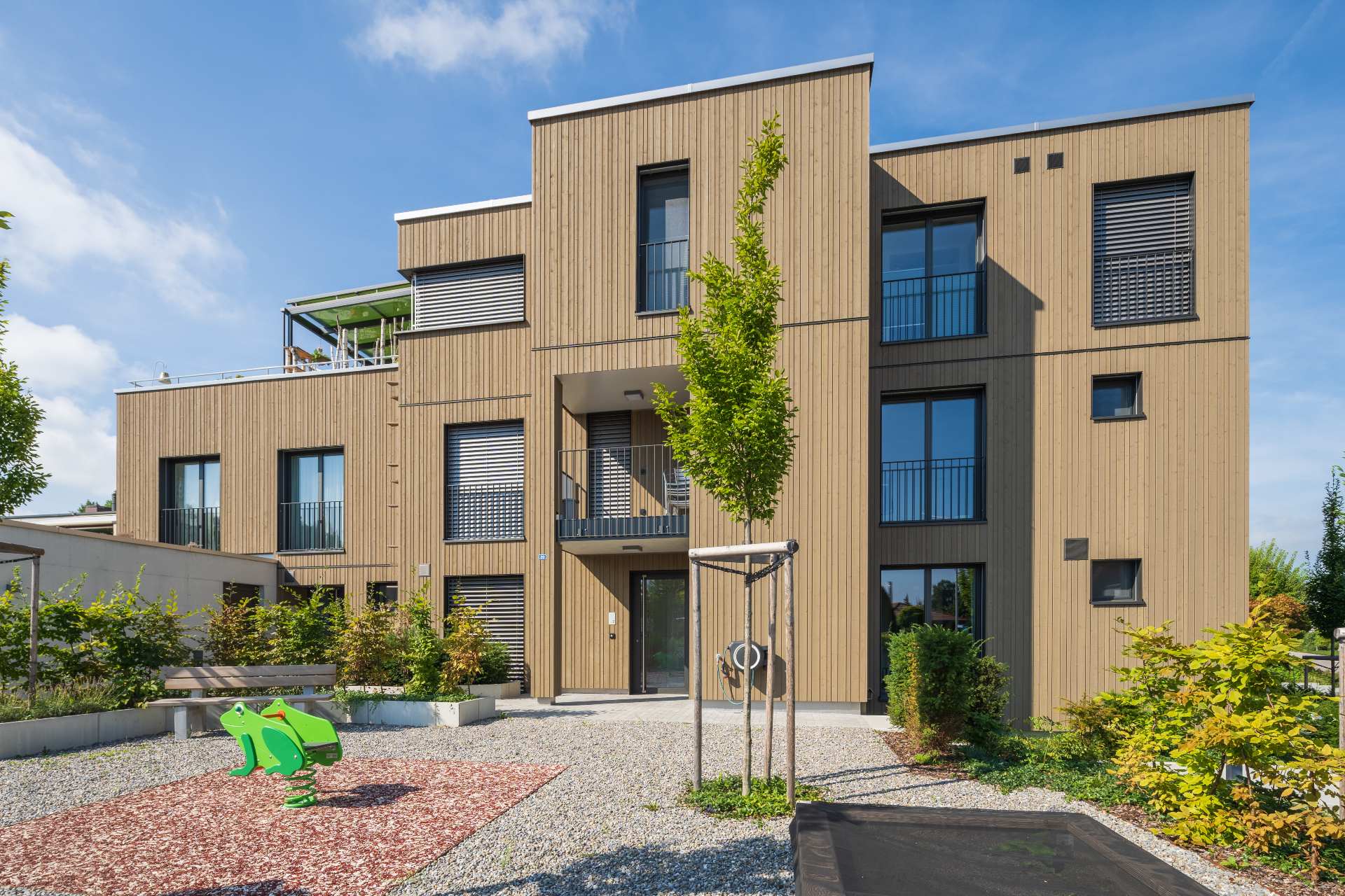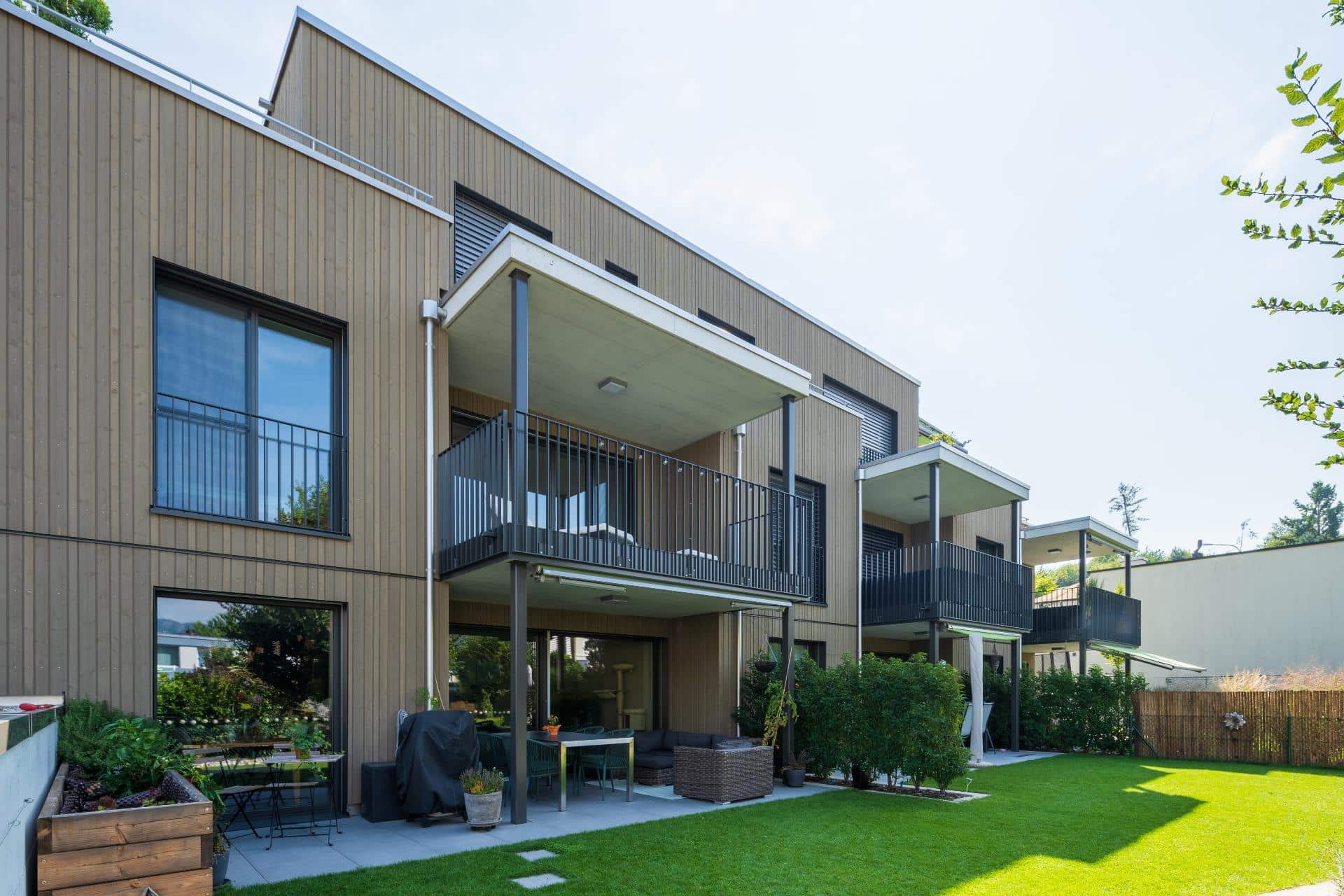 Der Neubau wurde in solider Massivbauweise erstellt und mit einer hochwertigen, hinterlüfteten Holzfassade ausgestattet. Die klare architektonische Sprache sowie die nachhaltige Materialisierung sorgen für ein zeitgemässes und wertbeständiges Erscheinungsbild.